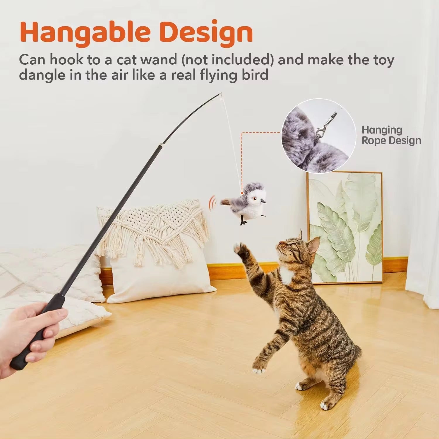 ✅ Realistic Movement – Built-in motion sensor activates flapping wings when your cat approaches or paws it, making playtime interactive and fun.